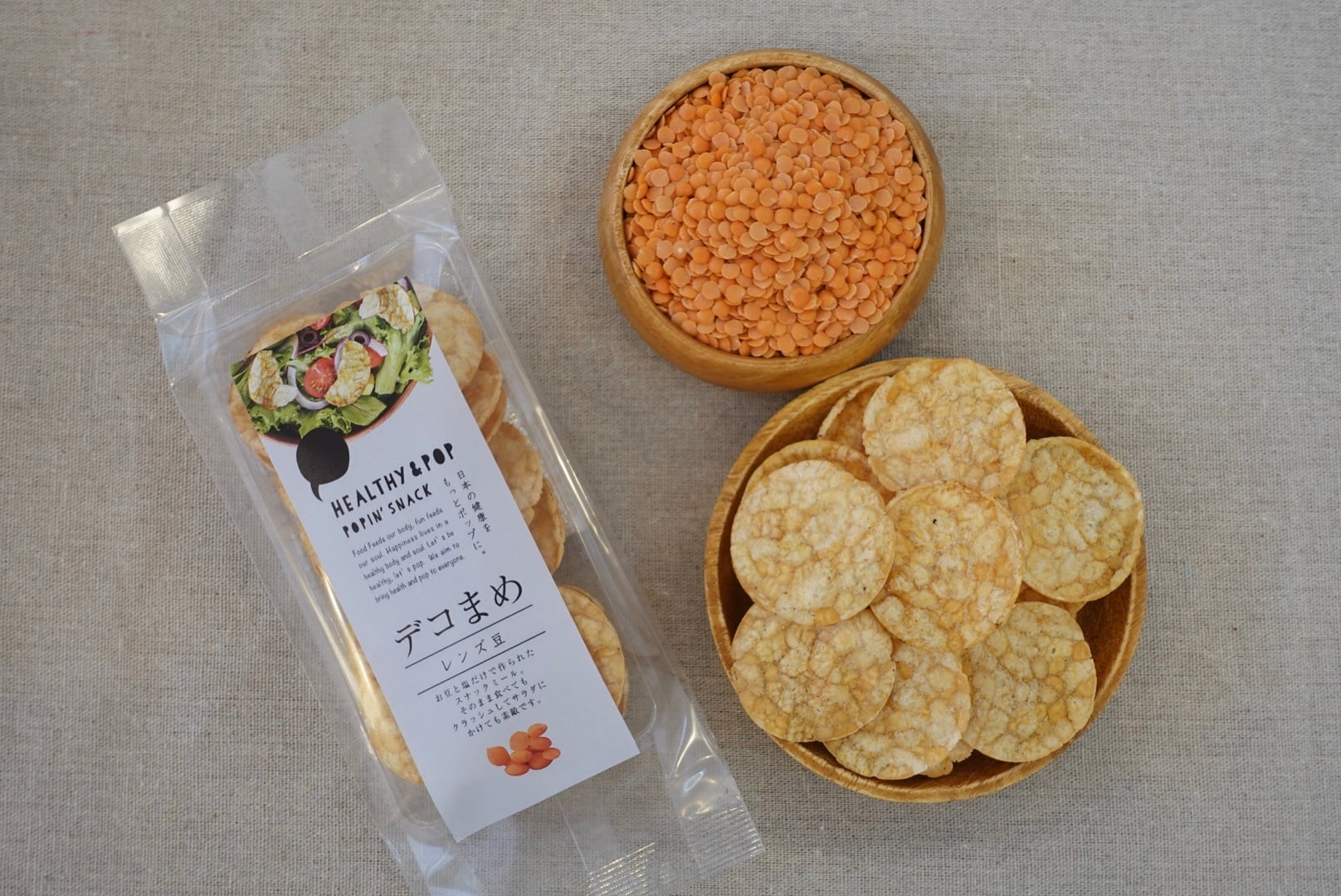 原料は、98%のレンズ豆と2%の塩(化学薬品不使用)だけで作られた、スナックミールです。